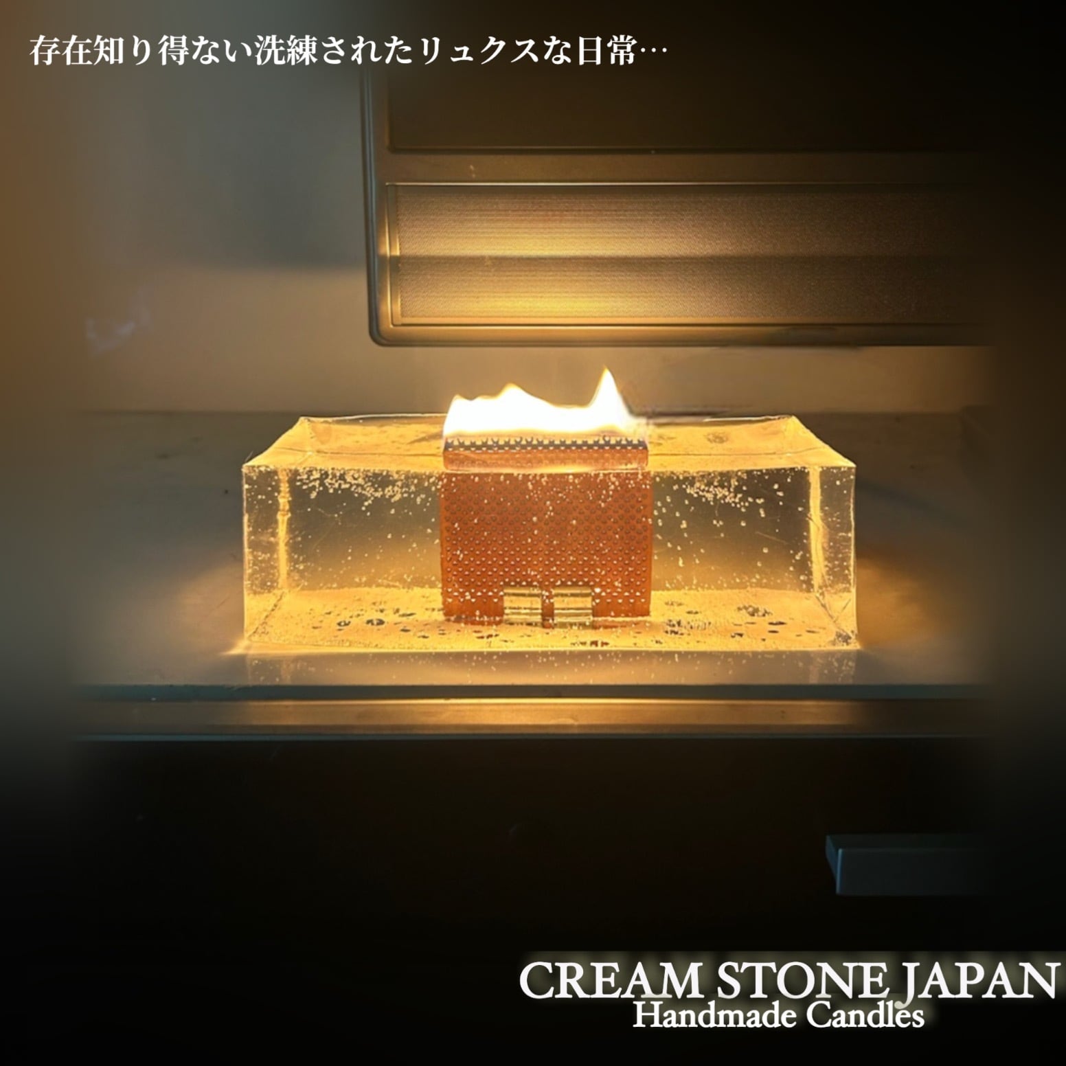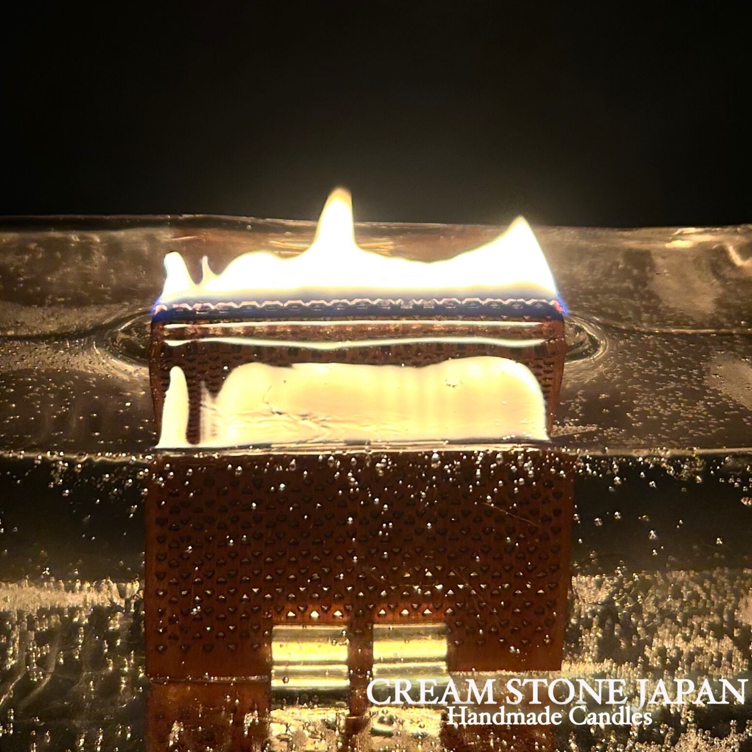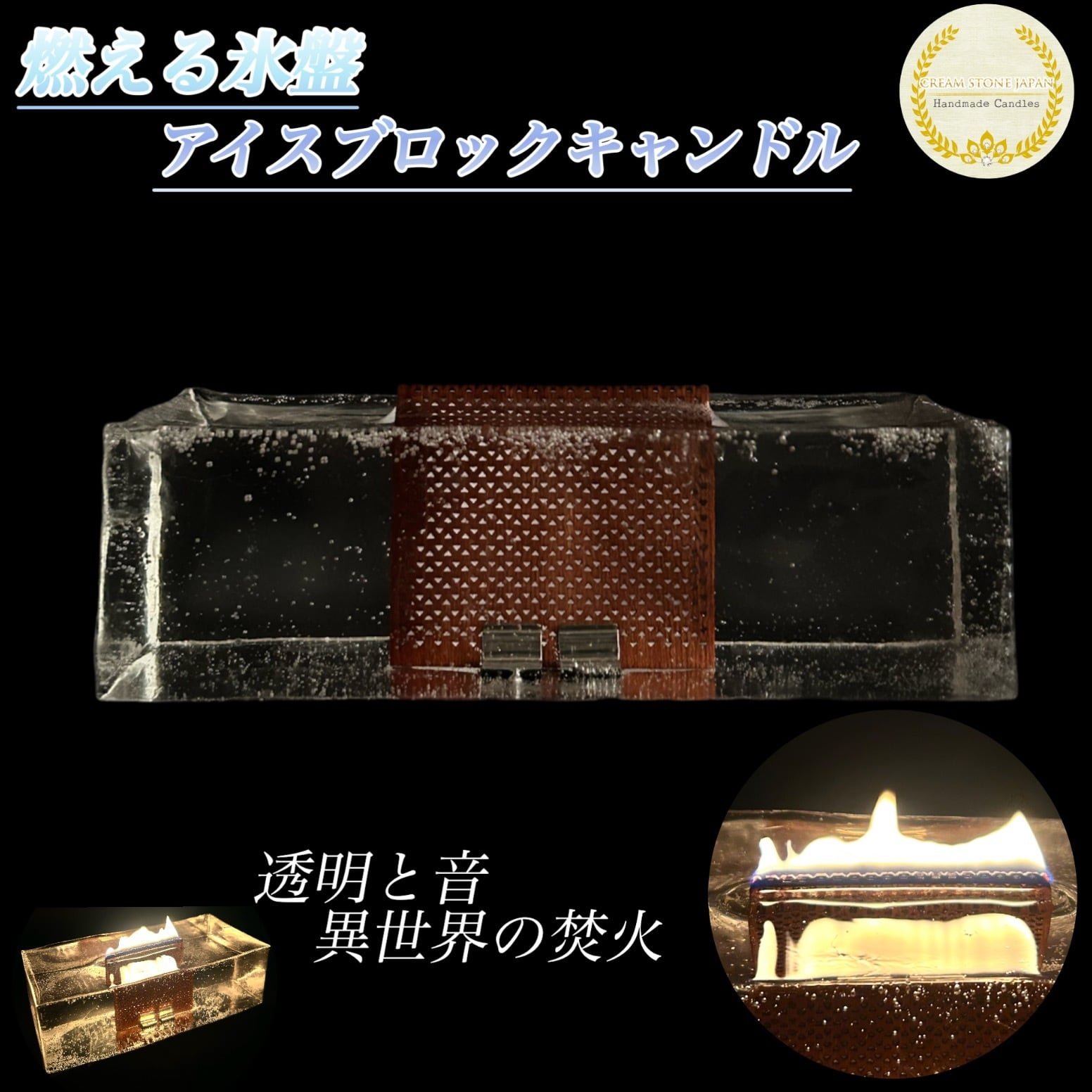 灯せば氷盤が燃えるように、焚き火が横長に広がってゆく美しいキャンドルです。